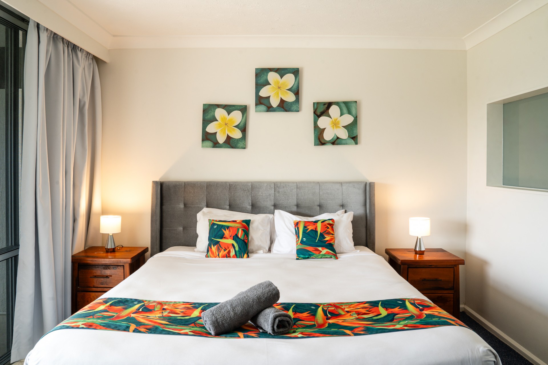 The apartment sleeps seven, with a king bed in the master suite, a single and a bunk in the second bedroom, plus a double sofa bed in the lounge. There is also a cot and highchair. Please note there is a $15 per night surcharge for any guests over 4.