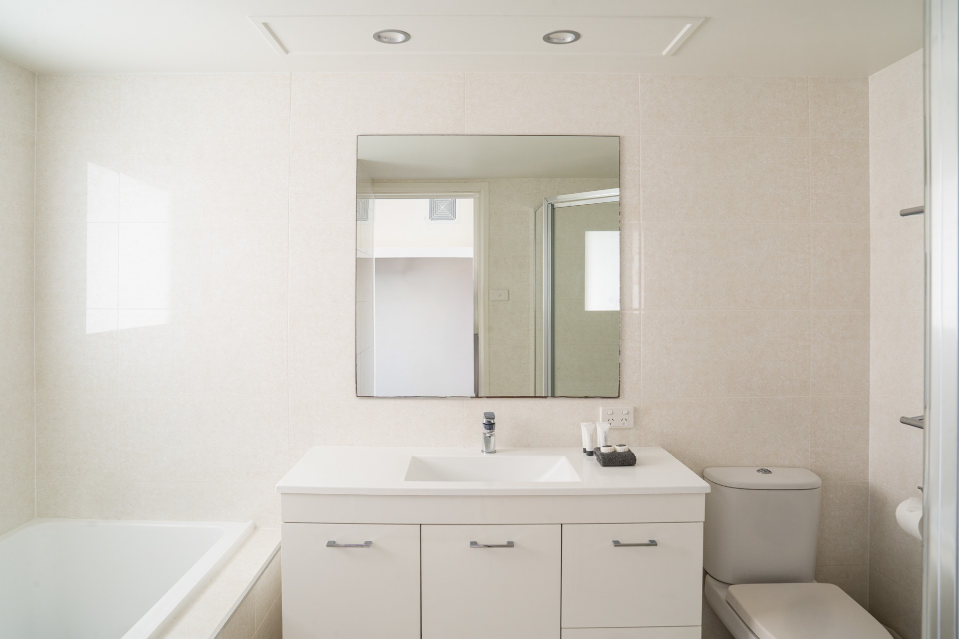 The main bathroom includes a modern bath.