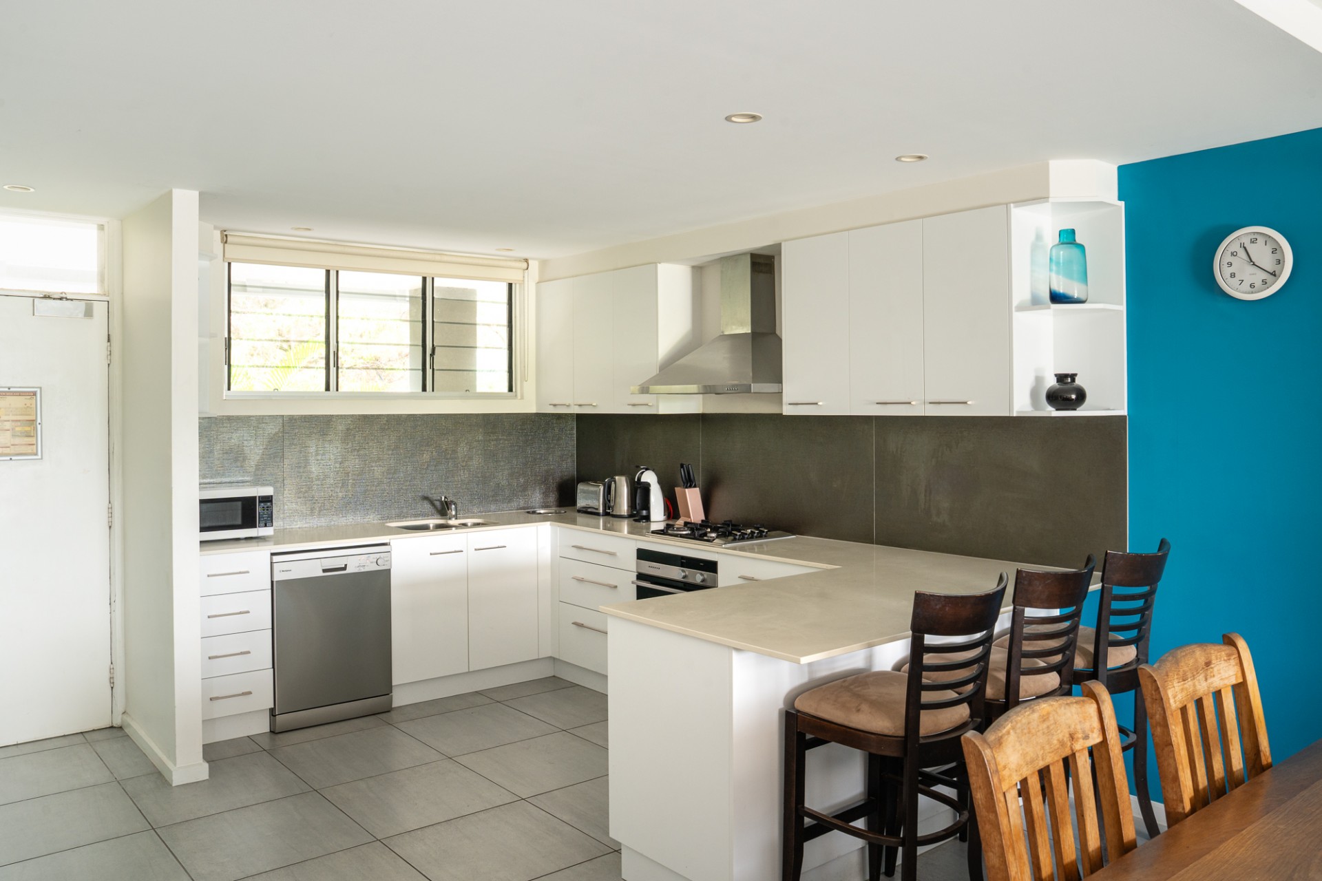 The fully equipped modern kitchen includes a dishwasher and microwave.